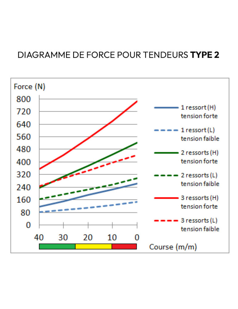 Les tendeurs existent également en tension faible (L) (1 ressort de 82 à 148 N / 2 ressorts de 164 à 296 N / 3 ressorts de 246 à 444 N).